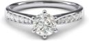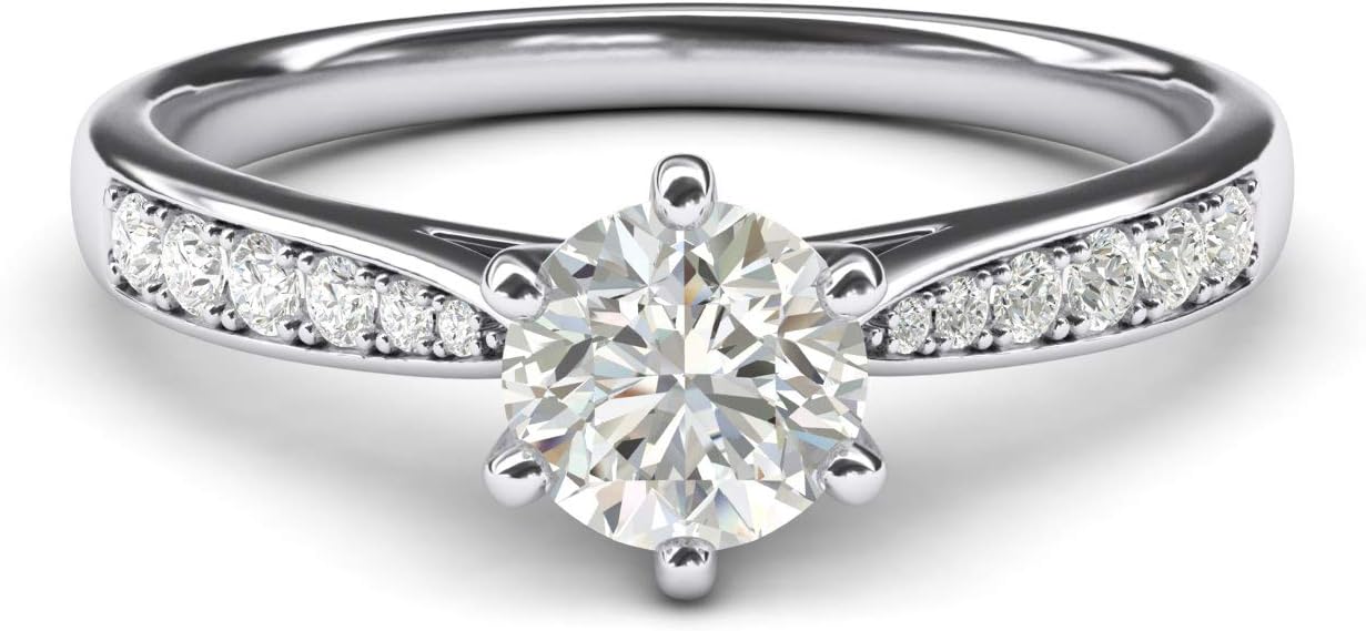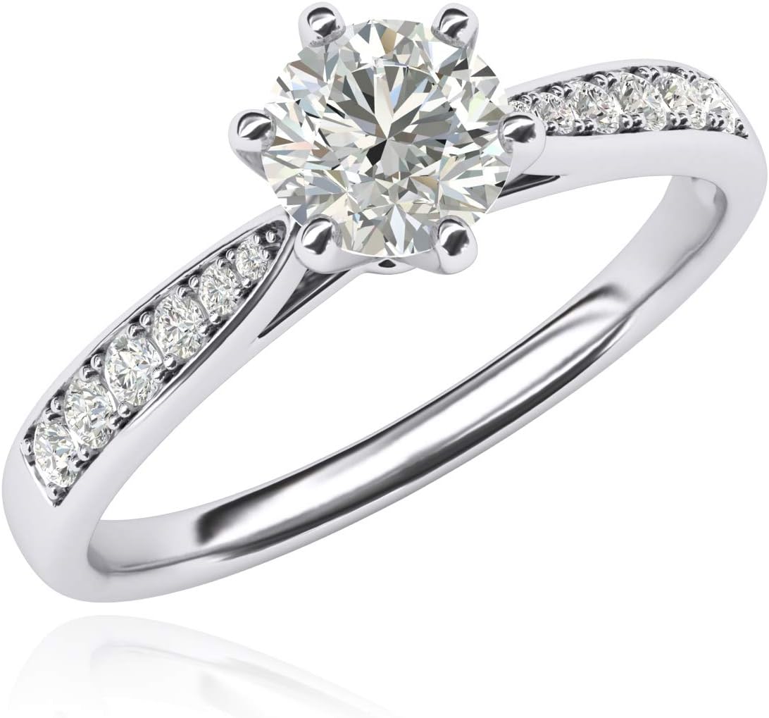 - This 14k white gold ring is all highly polished. It is 6-prongs set with one 6.5mm solitaire brilliant round Genuine Moissanite same diameter as 1.0ctw diamond. Unlike other items, all stones in this ring are moissanites, reflecting the sparkle same as diamonds do, which is very nice and attractive, making the ring look like real diamond ring. Each graduated shoulder is set with 6 additional graduated Genuine Moissanites to finish this timeless look.